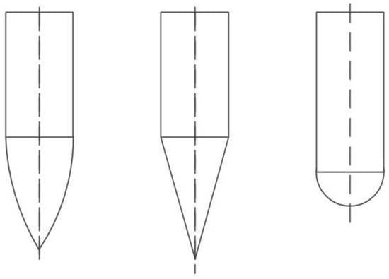 Whether the structural parameter design and material selection of the harpoon is correct has a great impact on the penetration performance of the harpoon. The shape of the harpoon’s head varies in penetration structure, complicating the research. Standard harpoons have conical, oval and semicircular heads, as shown in Figure 1.