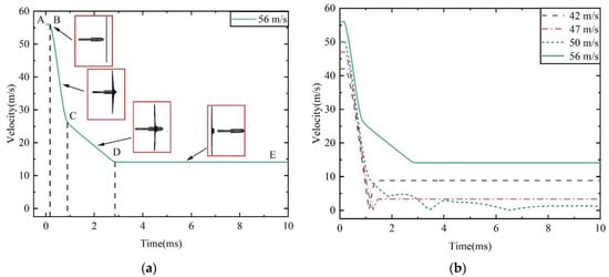 The impact results for the harpoon with an initial velocity of 56 m/s on the aluminum alloy target plate are shown in Figure 4a. The harpoon contacts the target plate at point B. When the harpoon head penetrates the target plate in the BC stage, its velocity decreases rapidly. The middle part of the harpoon passes through the target plate in the CD stage, and the velocity attenuation is mainly due to friction resistance. The harpoon leaves the target plate at point D, after which the remaining speed does not change.