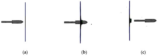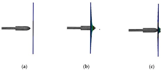 Simulation results for a launch speed of 56 m/s: (a) before penetration; (b) penetrating; (c) after penetration.