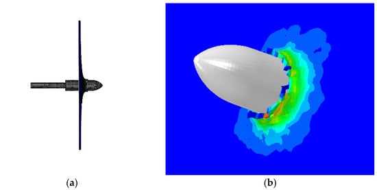 When the projection speed of the harpoon is 50 m/s, it is embedded in the target plate, as shown in Figure 7a. The connection details of the harpoon and target plate are shown in Figure 7b. The error between the simulation results of the harpoon’s speed embedding into the target and the theoretical results of the ballistic limit is 9.1%.