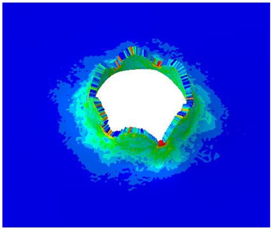 When the launching speed of the harpoon is 42 m/s, the harpoon fails to penetrate the target plate, as shown in Figure 5. When the harpoon penetrates the target, it first causes the middle surface of the target to deform and bulge. When moving forward, the tip of the harpoon pierces the target plate, and the target plate forms petal cracking at the hole, as shown in Figure 6. The diameter of the simulated hole is 18.1 mm.