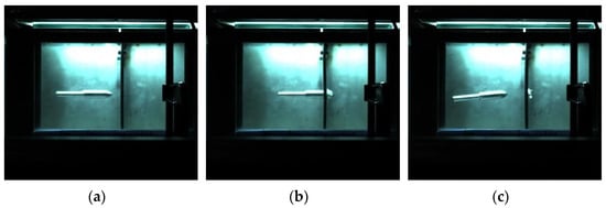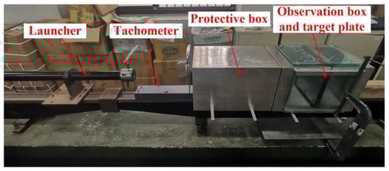 In order to verify the simulation model, the experimental design was carried out for the harpoon impacting the target plate. The layout of the test site is shown in Figure 10. The test layout includes a launcher, tachometer, protection box, observation box and target plate from left to right. The harpoon is placed inside the launcher. The transmitter is connected to the high-pressure gas cylinder, and the controller controls the gas emission pressure and emission switch. The whole test process was recorded by a high-speed camera. The shape and quality of the harpoon used in this test are the same as the simulation model. The aluminum plate struck by the harpoon is made of 2A12 aluminum alloy with a thickness of 2 mm.