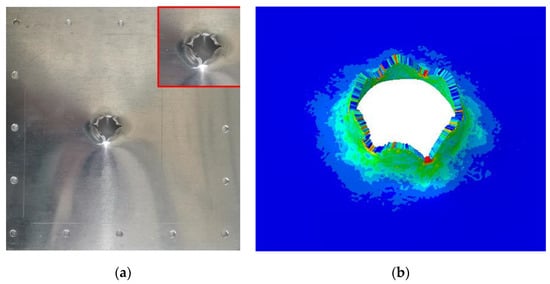 When the launching speed of the harpoon is 56 m/s, the harpoon penetrates the target plate, as shown in Figure 8. The harpoon pierces the target plate, which forms petal-shaped cracks at the hole, as shown in Figure 9. The diameter of the simulated hole is 20.1 mm.
