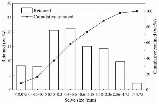 Furthermore, the sieve analysis of CS was carried out according to the aggregate screening method of Chinese standard JTG E42-2005. During the test, the dry coal gasification coarse slags, weighted by 500 g, were screened by hand until the mass of CS on each sieve remained stable. The sieve results are shown in Figure 1. Obviously, the particle size distribution of CS is mainly from 0.15 mm to 2.36 mm.