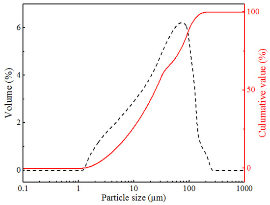 According to the ignition loss results, the CS with particle sizes which were more than 2.36 mm and less than 0.15 showed lower ignition loss, and thus were selected to be admixture of cement-based materials in this study. The selected CS was processed by means of ball milling (SM-500, China), and the milling time was two hours. The particle size distribution of the milled coarse slag (MCS) was determined by using a Mastersizer2000 testing machine, and the results are shown in Figure 2. Moreover, Table 3 shows the physical parameters of MCS.