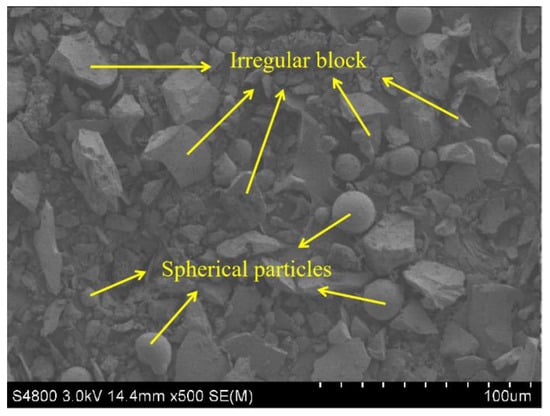 A SEM photograph of MCS is shown in Figure 4. As is demonstrated, most particles of MCS showed irregular block and some small spherical particles could be also observed clearly in the image.