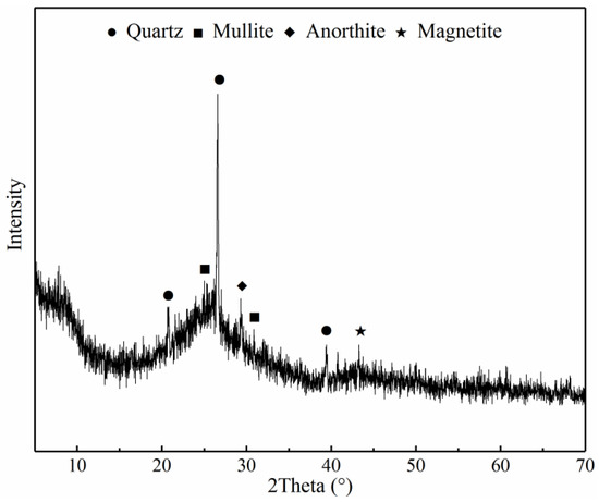 Figure 5 depicts the XRD pattern of the MCS. A small hump in the pattern corresponds to the presence of glassy phase and amorphous material in the MCS, observed at <15° and within 25°–35° of 2θ [26]. It can be found that some mineral phases, such as quartz and mullite, exist in MCS. The majority of those minerals possess pozzolanic activity. Moreover, the activity can be promoted by using various activators.