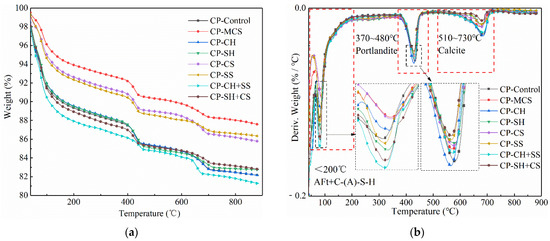 For the samples with alkali activators, the intensity of the second peak related to the content of Ca(OH)2 increased in CP-CH, and this was mainly caused by the addition of Ca(OH)2, while that was observed to decrease in CP-SH, owing to the consumption of Ca(OH)2 during pozzolanic reaction. Besides, the sample with NaOH showed higher weight loss below 200 °C, demonstrating that it had a better activation effect than Ca(OH)2. In general, the more hydration products, the better the promotion effect. This result was consistent with the previous analysis from XRD.