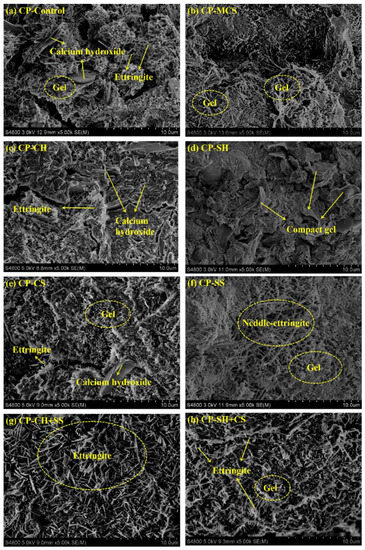 As can be seen from Figure 8g,h, considerable amounts of hydrated products could be clearly observed in the samples, which demonstrated that the synergistic activation of alkali and sulfate activators caused an obvious effect on the hydration of MCS. Moreover, the sample activated by Ca(OH)2 and Na2SO4 showed a more compact structure with needle-like phases crossing around each other and penetrating evenly in gels. Although CP-SH+CS from Figure 8h contained some fine ettringite crystals and amorphous gels, it showed a relatively loose structure. In conclusion, a better promotion effect on pozzolanic activity of MCS can be obtained from the synergistic activation of Ca(OH)2 and Na2SO4.