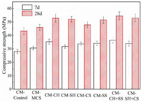 The mechanical strength of sample can indirectly reflect the formation of hydration products. The more the products contained, the higher compressive strength shown. The compressive strength values of cement mortars at the curing time of 7 and 28 days are displayed in Figure 10. It is obvious that the strength of samples increased after activators were added. Compared with CM-Control, the compressive strength of CM-MCS increased slightly, which could be ascribed to MCS filling into the pore structure of the hydrated products. Some researchers investigated the microstructure and strength development of quaternary blend high-volume fly ash concrete, and they pointed out that proper content of admixtures mainly acted as a filler at early age, which could play a nucleation effect on hydration process, thereby accelerating the reaction rate and promoting the formation of hydration products [31].