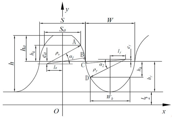 where and are the radius of convex and concave tooth arcs, respectively; and are the offset of convex and concave tooth centers, respectively; and and are the offset of convex and concave tooth centers, respectively. is the slope of the common tangent line, is the intercept, is the thickness of convex pitch wheel teeth, is the width of concave pitch tooth groove, is the root height, and is the distance from the root to the transverse coordinate. The specific parameter size is derived from the empirical formula.