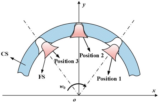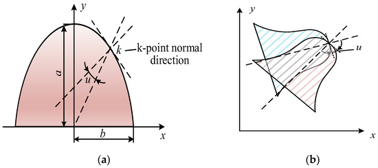 The above expression for the contact area of each discrete point applies to general gears. The flexspline engages will deflect, resulting in a change in the contact area. This is because it is propped up by the wave generator, which will produce periodic elastic deformation into an ellipse during operation. The deflection angle of the teeth of the flexspline is presented in Figure 7, and the deflection (u) can be used in this simulation as follows [12]: