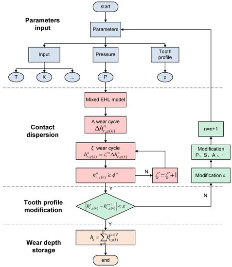 Based on the above equation, the wear depth after material removal is simulated by numerical method, and the wear numerical simulation flow is illustrated in Figure 5.