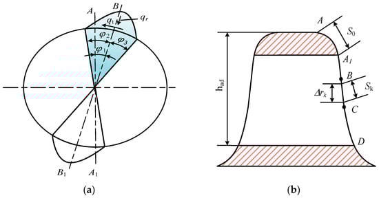 The load distribution on the teeth of flexspline and circular spline during differential tooth motion of harmonic drive gear is extremely complicated. It is dependent not only on the periodic elastic deformation caused by the bracing of the wave generator, but also on the input torque, tooth stiffness, assembly, and manufacturing. Therefore, it is difficult to express the load situation on harmonic gear teeth using equations. Kayabasi et al. [38] experimentally obtained the approximate relationship of load distribution as shown in Figure 6, where and are the the engagement region angles, and is the angle between the centers of the engagement regions BB1 and AA1 at the wave generator’s long axis support. According to the ring theory and the meshing principle of harmonic gear teeth, the two angles and are considered to be approximately equal. The unit width load on the tooth surface in each direction in the region can be expressed as