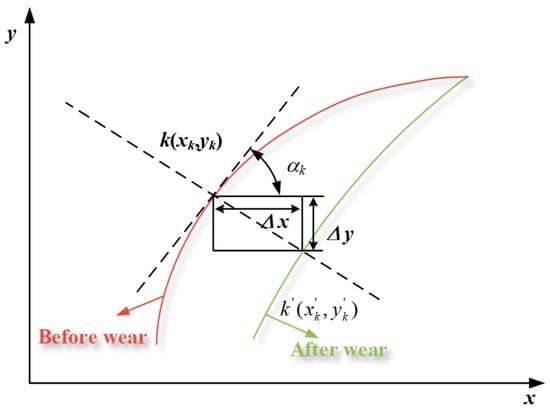 The changes in tooth profile and slope angle before and after the wear of harmonic gear is displayed in Figure 8. Before wear, the coordinates of a meshing point (k) are , and after a period of wear, the coordinates are . The profile change is shown below: