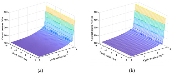 This analysis is based on the calculation parameters and wears cycle flow described above. The wear simulation analysis was conducted under the following operating conditions: an input torque of 16 Nm, an input speed of 1200 rpm, and a swing angle of ±36°. In order to simulate the realistic conditions of harmonic tooth wear, the amount of wear in and out of engagement is defined as equal, which is due to the fact that wear exists on both the left and right sides of the gear teeth. The variation in the average contact pressure with tooth width and number of wear cycles, as obtained by contact analysis, is displayed in Figure 9. It can be seen that both double-arc and involute tooth profiles have a more uniform contact pressure distribution along the tooth width direction in ideal conditions. The average contact pressure is directly proportional to the cycle number. With wear cycles, the average contact pressure on the tooth surface gradually increases. After reaching a certain number of cycles, the contact pressure rises rapidly, at which time the harmonic gear tooth changes from the stable wear stage to the severe wear stage, and the gear tooth is damaged. As seen in Figure 9a, the average contact pressure of the double-arc tooth profile increased dramatically after 4 × 1010 cycles, reaching 444.66 MPa. As presented in Figure 9b, the average contact pressure of the involute tooth profile changed in the same way after 2.8 × 1010 cycles, with the contact pressure value increasing to 481.67 MPa. The double-arc tooth profile is able to take more wear cycles under the same operating conditions, as is made clear when comparing the two tooth profiles. The contact pressure of the double-arc tooth profile is less than that of the involute tooth profile during the whole operation.