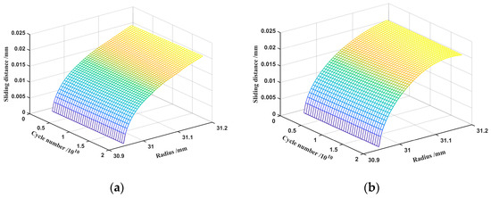 In the listed wear equation for mixed EHL, the tooth surface sliding distance, in addition to the contact pressure, is a critical element impacting the wear depth, which is proportional to the quantity of wear. Figure 10 shows the maximum sliding distance at the top of the flexspline teeth, which decreases as it approaches the root of the teeth. As wear continues, the sliding distance of each contact point on the working tooth profile has the tendency to fluctuate and increase overall. Figure 10b shows that the sliding distance at the top of the involute tooth profile is 0.022 mm after 2 × 1010 cycles. Figure 10a shows that the sliding distance of the top of the double-arc tooth profile is 0.021 mm after the same number of wear cycles. The sliding distance of the involute tooth profile is slightly greater than that of the double-arc tooth profile under the same working conditions. Overall, the effect of tooth profile on the sliding distance is almost negligible.