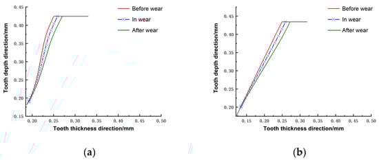 Figure 11 shows the change in tooth profile after wear. The red curve indicates the tooth profile before wear, the blue curve indicates the tooth profile after 2.56 × 109 wear cycles, the green line represents the tooth profile after 6.28 × 109 wear cycles, and the black curve indicates the top of the flexspline and the part not affected by wear. It can be seen that the tooth surface wear of the harmonic gear is proportional to the number of wear cycles: the more cycles, the greater the wear depth. Whether it is a double-arc tooth profile or an involute tooth profile, the wear is the greatest at the top of the tooth, and the amount of wear gradually decreases from the top to the root of the tooth. The distribution of wear obtained from the simulation is consistent with the actual wear (Figure 1). This trend also corresponds exactly to the x-axis of Figure 10. This is due to the fact that the contact pressure () and sliding distance () at the tooth’s root is the greatest; therefore, the wear depth is the greatest here. There is a section at the root of the tooth that suffers no wear because it is not involved in the engagement.