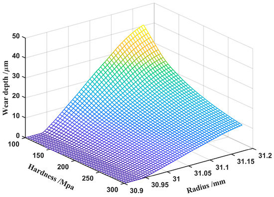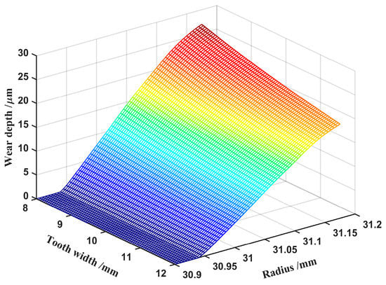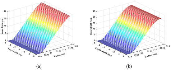 In order to visualize the distribution of wear depth, Figure 12 depicts the wear depth along the tooth width and the radius of the flexspline under ideal conditions. The wear is uniformly distributed along the tooth width axis, with the same trend as that of Figure 9 along the y-axis. The output data from the numerical simulation show that the locations on the harmonic gear where the contact pressure is high have significant wear depths, and the locations where the contact pressure is low have slight wear depths. Equation (12) also shows that the contact pressure () is proportional to the wear depth. The contact pressure and the wear depth are increased by comparing Figure 9 and Figure 11 with the number of wear cycles. It can be inferred from this that engagement leads to a constant generation of wear, resulting in a subsequent increase in contact pressure, which further increases wear depth and wear rate. The two are mutually dependent.