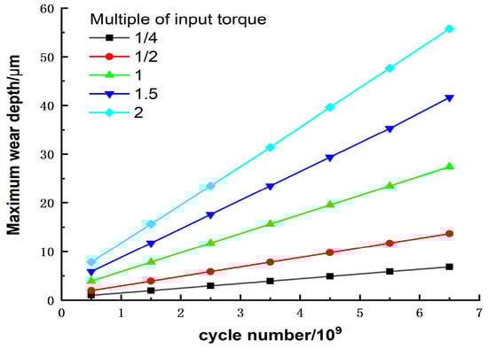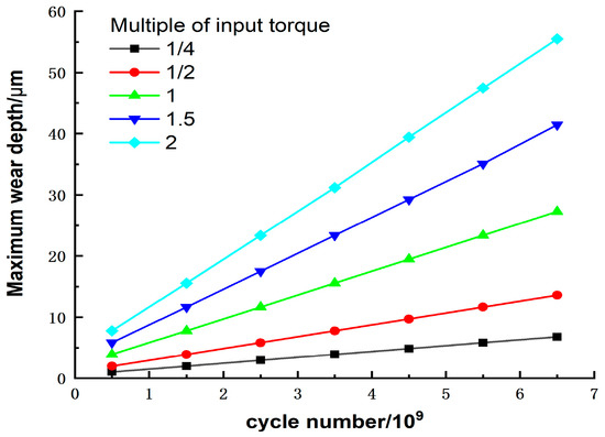 The variation of the maximum wear depth with the input torque and the number of wear cycles is shown in Figure 14. It can be seen that the input torque significantly affects the tooth surface wear depth. When the number of wear cycles remains constant, the higher the torque, the greater the maximum wear depth. At the same torque, the wear depth also increases with the number of wear cycles, which is the same conclusion as that obtained from Figure 11. As such, the wear depth is greatest at the maximum torque and cycle number. This is because the input torque is positively related to the load, and the contact pressure at each contact point of the tooth surface increases with increases in the load. The contact pressure and the wear depth are coupled with each other, so that an increase in either results in greater wear output.