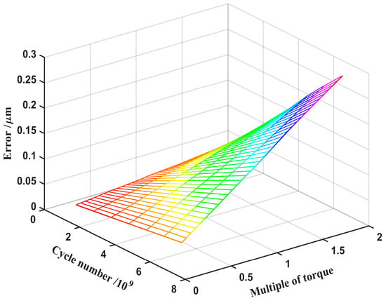 The value of the wear depth with and without the engagement offset is subtracted as the error amount for calculating the wear depth. The effect of the engagement offset on the wear depth is shown in Figure 16. It can be concluded that the errors are negligible when the number of cycles and the input torque are lower. However, the error amount increases more significantly with both the wear cycle and the increase in input torque, in which the influence of torque on the error amount is more evident than the number of cycles. Therefore, whether or not to consider the meshing offset can lead to differences in the wear depth. As the tooth surface wear becomes more severe, the amount of error generated is also more significant. The meshing offset due to elastic deformation must be accounted for in the study of the wear mechanism and life evaluation.