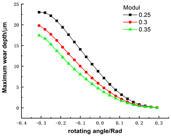 The gear diameter is equal to the number of modules multiplied by the number of teeth. When the number of teeth is constant, the larger the modulus, the larger the diameter of the gear, and the greater the bending fatigue strength. However, the size of the harmonic drives cannot be too large in space, and a larger modulus will cause the overall model to exceed the design limits. Therefore, it is crucial to choose the appropriate modulus for harmonic drive gears. In this paper, we choose moduli of 0.25, 0.3, and 0.35 for the study of wear influence. The effect of modulus on wear depth is shown in Figure 17. In this study, we equated the radius to the rotating angle. When the modulus is different, the wear on the top of the tooth is still the largest and that on the root is the smallest. Therefore, the modulus does not change the distribution of the harmonic gear tooth wear. As the modulus increases, the tooth surface wear at each contact point of the working tooth profile tends to decrease. The pattern of wear depth change with modulus is also consistent with other studies’ findings [32]. The contact area of the engagement increases, and the contact pressure decreases at this time, leading to a reduction in wear depth. Therefore, the higher the modulus of the harmonic gear tooth, the more uniform the wear in the contact area of its profile.