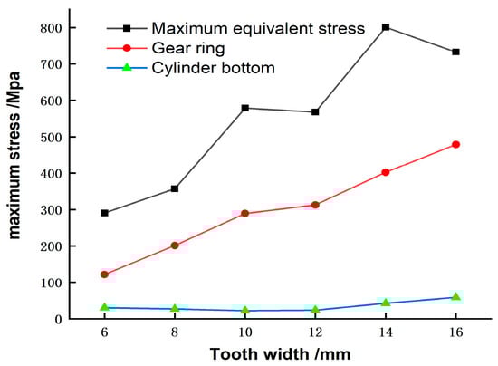 In the process of designing and optimizing the harmonic drive, in order to reduce the fatigue fracture of the flexspline caused by cyclic elastic deformation, it is necessary to reduce its equivalent force. First, we must study the influence of parameters such as tooth width, barrel length, and wall thickness on the stress of the flexspline, and then perform multi-objective optimization. The effect of the resulting tooth width on the stress in the flexspline is shown in Figure 18. As the tooth width increases, the stress on all parts of the ring increases [40]. Therefore, selecting a narrower tooth width will effectively prevent tooth failure due to fatigue fracture.