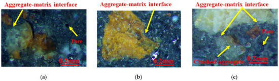 Aggregates of different roughness will have different effects on the microstructure of concrete [33,34]. Table 5 presents the mesoscopic pictures of GT and sand with different particle sizes. As depicted in Table 5, sand particles were relatively smooth, and the surfaces of GT particles were rough.