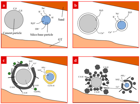 The hydration mechanism of cementitious materials (C3S—Tricalcium Silicate, C2S—Dicalcium Silicate, C–S–H—Calcium Silicate Hydrate). (a) Film formation; (b) cementitious material absorbs water in the GT–sand system; (c) C–S–H gel is gradually formed in the GT–sand system; (d) cement and silica fume particles are consumed, producing C–S–H; (e) a large number of C–S–H gels are formed in the GT–sand system.