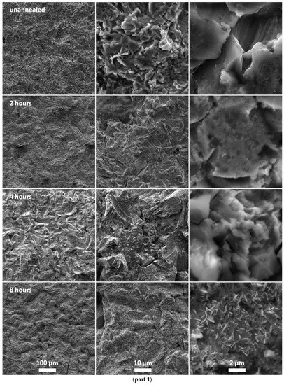 Scanning electron microscopy images at 1000 × (left), 10,000 × (middle) and 50,000 × (right) magnification: part 1—unannealed sample and samples annealed for 2, 4 and 8 h; part 2—samples annealed for 16, 32, 64 and 128 h.