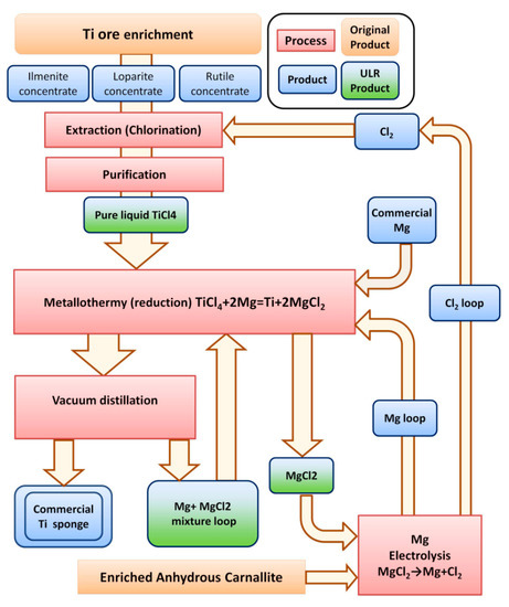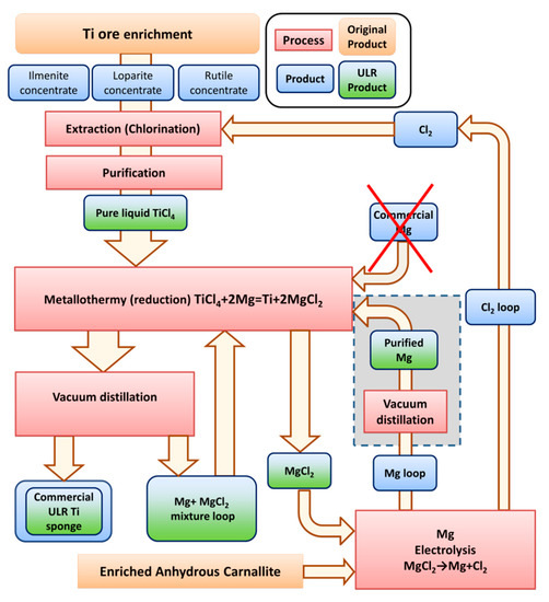 Simplified scheme of the industrial titanium sponge production process [8,10]. Ultra-low-radioactive (ULR) products discovered within the ULR titanium R&D are marked in green.