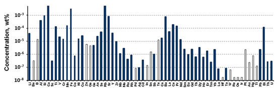The total quant method [11,12] was used for determination of 65 chemical elements’ concentrations. The quantitative analysis of Th and U was carried out using the “additives” method taking into account the concentration of the main (Mg matrix) elements in the analyzed solution. The standard solutions (PerkinElmer Inc.) were used for calibration. The optimized operating mode of the NexION300D spectrometer for impurity analysis of samples with Mg matrix element is presented in Table 2.