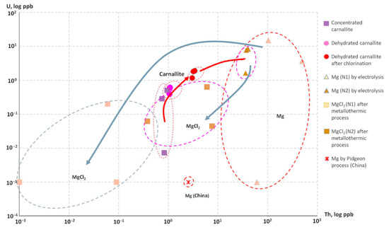 Figure 4 presents the competing processes of the Th and U contamination of Mg in the process of Mg production: (1) an increasing of Th and U contamination in the electrolysis method and (2) a decreasing of Th and U concentrations in the metallothermic process. It can be observed how the contamination level rises at each subsequent stage of Mg production and reaches a maximum in commercial Mg ingots obtained by the electrolysis process.