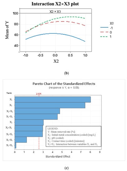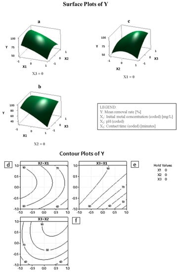 | Initial metal concentrations (X1) | 10 mg L−1 | −1 | 30 mg L−1 | 0 | 50 mg L−1 | 1 |