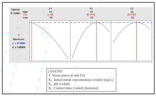 | X1 | X2 | X3 | X1 [mg L−1] | X2 | X3 [min.] | Ypred [%] | Yexp [%] | |