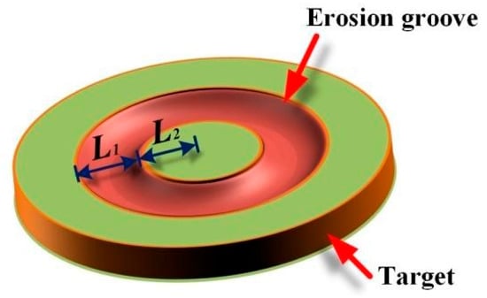 Sketch of the erosion groove on the circular planar target (L1 = 15 mm, and L2 = 5 mm).