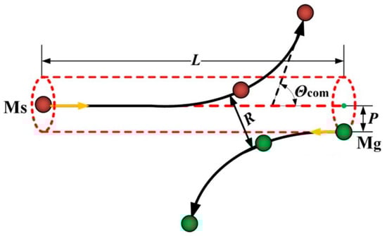 Figure 2 shows a typical binary collision in the center of mass coordinate system. As shown in Figure 1, a sputtered atom (Ms) collides with a background gas atom (Mg) with a collision parameter of p. The scattering angle of Ms after collision is θcom, which can be determined as [26]: