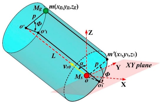 Figure 3 shows the initial relative positions between the sputtered atom (Ms) and background gas atom (Mg) in three-dimensional space when they collide with a collision parameter of p. As shown in Figure 3, the red ball at point o (0, 0, 0) represents Ms, while the green ball at point m (xg, yg, zg) denotes Mg. It can be seen that Ms and Mg are situated at the bottom surface center and the upper surface edge of an arbitrary spatial cylinder, respectively. The central symmetry axis of the spatial cylinder is along the direction of vr (the relative velocity between Ms and Mg), and the radius and height of the spatial cylinder are p (collision parameter) and L (the distance between Ms and Mg along the direction of vr), respectively. In the present simulation, L was set to the cutoff radius of the potential function U(r) in order to save computation time. Then, the initial location of Mg can be expressed as: