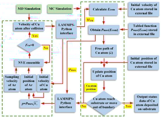 In this study, the MC-MD coupling simulation of sputtered particle transport was realized by the LAMMPS input script program, where the LAMMPS-Python interface was used to invoke the python functions for the MC simulation defined in external files. Specifically, the MD simulation of the elastic collision between the sputtered atom and the background gas atom was performed to calculate the post-collision velocity of the sputtered atom, which was written into a dump file. The MC simulation of the free-flight process of the sputtered atom was conducted by Python functions, which were defined to calculate the free path of the sputtered atom and update the location of the sputtered atom according to the velocity data read from the dump file. The data exchange between the MD and MC simulations was realized via the LAMMPS-Python interface. In this MC-MD coupling simulation, one sputtered Cu atom was tracked at each simulation loop in the three-dimensional space between the target and substrate until it arrived at the substrate or escaped from the monitoring space, and then the next sputtered Cu atom was emitted and followed. This procedure was repeated until a total of 1,000,000 Cu atoms were released. The flow charts of the MC-MD coupling simulation are shown in Figure 4.