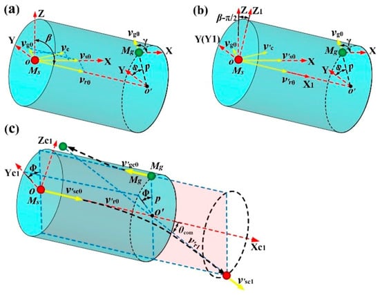 Scattering collision between sputtered Cu atom (Ms) and background gas atom (Mg) with specific initial velocities. (a) Initial velocities and positions of Ms and Mg in the laboratory coordinate system XYZ; (b) initial velocities and positions of Ms and Mg in the laboratory coordinate system X1Y1Z1; (c) scattering collision between Ms and Mg in the center of mass coordinate system Xc1Yc1Zc1 when the coordinate system X1Y1Z1 floats with the mass center of colliding atoms.