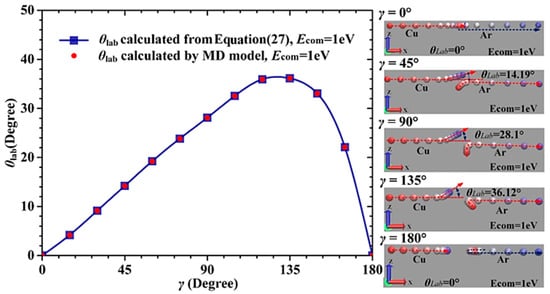 Figure 6 shows the variation of θlab with the initial velocity direction of the Ar atom when Ecom, p and EAr are kept at 1 eV, 0 Å, and 0.0387 eV, respectively. As shown in Figure 6, the values of θlab calculated by the MD collision model are consistent well with those calculated by Equation (27), which validates the reliability of the MD collision model. When Ecom = 1 eV and p = 0 Å, θlab increases first and then decreases as γ increases from 0° to 180°, and the maximum value of θlab is 36.12°. Accordingly, the initial velocity direction of the background gas atom significantly affects the scattering angle of the sputtered atom, but this effect cannot be considered in Equation (28).