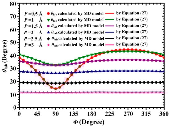 Figure 8 shows θlab as a function of the initial position azimuth angle of the Ar atom (Φ) when Ecom, EAr and γ are kept at 1 eV, 0.0387 eV, and 90°, respectively. In Figure 8, the values of θlab were calculated individually by Equation (27) and MD collision model as Φ ranged from 0° to 360° and p increased from 0 to 3 Å. As shown in Figure 8, the values of θlab calculated by the MD collision model are coincident with the corresponding values of θlab calculated by Equation (27). As shown in Figure 8, when Ecom= 1 eV and 0.5 Å ≤ p ≤ 1.5 Å, the values of θlab change significantly as Φ increases from 0° to 360°. Accordingly, the initial position azimuth angle of the background gas atom (Φ) exerts a significant influence on the scattering angle of the sputtered atom. However, this influence cannot be considered in Equation (28).