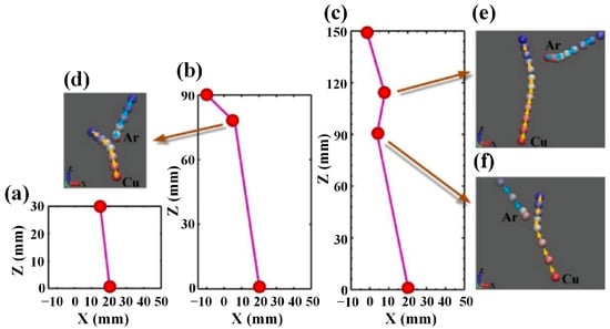 Figure 9 displays the transport processes of an identical sputtered Cu atom in argon gas when the target-substrate distance is set to 30, 90, and 150 mm, respectively. Figure 9a–c depicts the macroscopic trajectories of the sputtered Cu atom, while Figure 9d–f show the microscopic evolution of elastic collisions between Cu and Ar atoms. As shown in Figure 9a, at the target-substrate distance of 30 mm, the sputtered Cu atom is directly deposited onto the substrate surface without being subjected to any collision. As shown in Figure 9b,c, at the target-substrate distances of 90 and 150 mm, the sputtered Cu atom undergoes one or more scattering collisions before it ultimately arrives at the substrate surface since the target-substrate distance exceeds the free path of the sputtered Cu atom. From the microscopic trajectory of the sputtered atom shown in Figure 9d–f, it can be seen that the spacing between the two adjacent positions gradually reduces as time goes on, while the case for the trajectory of the Ar atom is just reversed. This means that the kinetic energy of the sputtered Cu atom decreases while that of the Ar atom increases, which indicates the occurrence of energy transfer between Cu and Ar atoms. Furthermore, comparing Figure 9d with Figure 9b and Figure 9e,f with Figure 9c, respectively, it can be found that the variations in the motion direction of the Cu atom on the microscopic scale are consistent with those in the macroscopic scale, which suggests that the coupling of the MD and MC simulations has been successfully implemented.