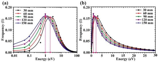 The incident energy of sputtered Cu atom striking the substrate surface is a key parameter that influences the crystalline microstructure [31] and grain size [32] of the sputtered film. Figure 10 displays the incident energy distributions of sputtered Cu atoms under different target-substrate distances. To clearly display the incident energy distributions in the low energy regime (E < 1 eV) and moderate energy regime (1 eV < E < 30 eV), the distribution curves were plotted on both logarithmic and linear scales. As target-substrate distance increases from 30 to 150 mm, the proportion of the deposited atoms with incident energy less than 1 eV gradually increases, while the fraction of the deposited atoms with incident energy ranging from 2 to 30 eV significantly decreases, and the peak energy of kinetic energy distribution gradually shifts from 2 to 1 eV. This indicates that, as target-substrate distance increases, more sputtered atoms with moderate kinetic energy (i.e., of the order of 10 eV) are gradually thermalized during the transport process in the gas phase, which is due to the fact that the increased target-substrate distance is gradually equal to or greater than the free paths of these sputtered atoms. As shown in Figure 10b, the incident energy distribution of deposited Cu atoms resembles a Maxwellian-type distribution with a peak energy of about 1–2 eV and a high-energy tail extending to 30 eV, which is consistent with the experimental results and theoretical calculation results reported in Ref. [25] and Ref. [33], respectively.