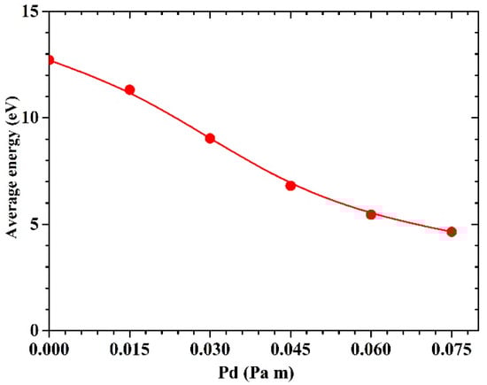 The average energy of deposited Cu atoms is an important parameter to characterize the energy deposition onto the substrate. Figure 11 shows the values of average energy calculated by the MC-MD simulation under different Pd values (the product of pressure and target substrate distance). It can be seen that, as the Pd value increases from 0 Pa m to 0.075 Pa m, the values of average energy calculated undergo an approximately exponential attenuation. In addition, the reduction of average energy is more significant as the Pd value increases from 0.015 Pa m to 0.045 Pa m. This might be mainly due to the fact that some sputtered atoms in the energy range of 2 to 30 eV (approximately account for 70% of total sputtered Cu atoms) are subjected to at least one elastic collision and gradually lose their energy since their mean free paths range from 41.6 to 113.7 mm and their energy loss in the first few collisions is normally greater than that in the subsequent collisions. The average energy values of Cu atoms arriving at the substrate are higher than those calculated in Ref. [10] and Ref. [34]. In our MC-MD simulation, energy-dependent collision cross-sections were used. Therefore, the mean free path of sputtered atoms is significantly greater at higher energies than that used in Ref. [34], which results in less energy loss of Cu atoms. Furthermore, the maximum energy in the initial energy distribution of Cu atoms in Ref. [10] and Ref. [34] was set to 40 eV. This artificial limitation for the upper-limit energy in the initial energy distribution improves computational efficiency but leads to the lower average energy of sputtered atoms [33].