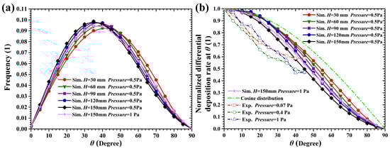 Figure 12b shows the normalized distribution of differential deposition rate in unit solid angle displayed in Figure 3 of [38] and those transformed from the incident polar angle distributions shown in Figure 12a. In Figure 12b, all the probability density values are normalized by those at the polar angle of 0°, i.e., normal to the target surface. Due to the difference in process conditions (PD values) between our simulation and the experiment in Ref. [38], the distribution curves obtained by simulation calculation cannot be exactly consistent with those measured by the experiment, but the distribution curves derived by the two approaches are similar in shape. In addition, as the PD value increases from 0.015 to 0.075 Pa m, the distribution curve of differential deposition rate in unit solid angle becomes more forward-peaked, while as the PD value further increases to 0.15 Pa m (Pressure = 1 Pa, H = 150 mm), the distribution curve changes reversely, approaching the cosine distribution. These changes in the calculated distribution curve with the increase of PD value agree with the variation of experimentally measured distribution in Figure 3 of Ref. [38]. It suggests that our simulation results can correctly reveal the effect of the PD value on the incident angle distribution of deposited atoms.