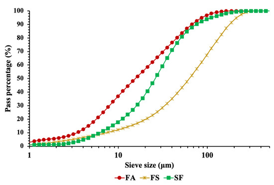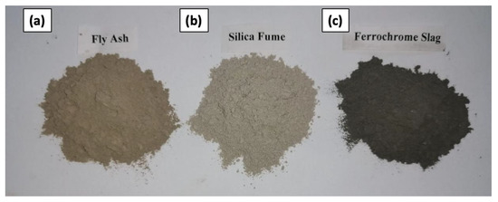 Industrial wastes such as FA, FS, and SF were acquired from the local brick, ferrochrome, and silicon industry. The physical properties of FA, FS, and SF are listed in Table 2. Figure 2a–c represents the digital image of FA, SF, and FS, respectively. The particle size distribution of industrial wastes is shown in Figure 3.