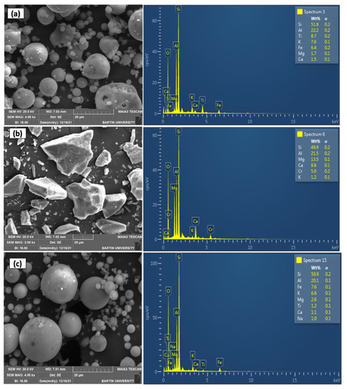 The scanning electron microscope (SEM) and Energy Dispersive X-ray (EDX) analysis of FA, FS, and SF were conducted to assess their topography and elemental composition, as shown in Figure 4a–c, respectively. The SEM images (taken at the magnification of 20 µm) reveals that the particle shape of FA is spherical with pores of varying diameters and several small size particles adhere to the large size particles (see Figure 4a). The EDX image shows that FA is composed of high quantity silicon (Si) (51.8 wt%) and aluminum (Al) (22.2 wt%), moderate quantity of titanium (Ti) (8.7 wt%), potassium (K) (7.6 wt%), iron (Fe) (6.4 wt%) and minor fractions of magnesium (Mg) (1.7 wt%) and calcium (Ca) (1.5 wt%). On the other hand, the topography of FS particles is rough with an angular particle shape, as shown in Figure 4b. Like FA, FS also contains a high amount of Si (49.9 wt%) and Al (21.5 wt%) but contains an adequate amount of Mg (13.5 wt%), Ca (8.8%), Chromium (Cr) (5.0 wt%) and a minimal amount of K (1.2 wt%). The particle shape and topography of SF is way more spherical and smoother than FA, respectively (see Figure 4c). The elemental composition of SF contains Si, Al, Fe, K, Mg, Ti, Ca, and sodium (Na) in an amount of 59.9 wt%, 20.1 wt%, 7.6 wt%, 6.6 wt%, 2.6 wt%, 1.2 wt%, 1.1 wt%, 1 wt%, respectively.