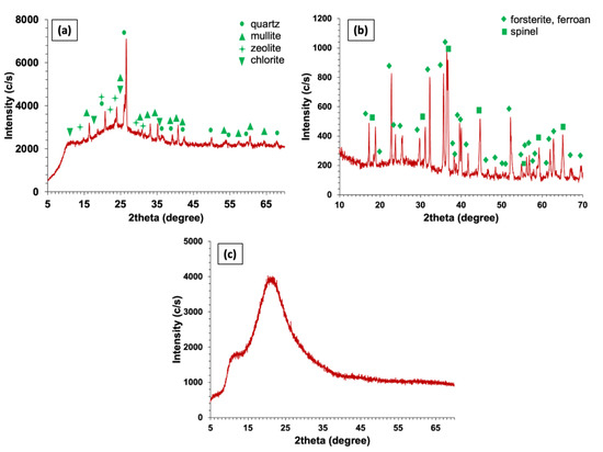 Figure 5a–c represents the XRD patterns of FA, FS, and SF, respectively. Figure 5a shows that FA is mainly composed of quartz, mullite, zeolite, and chlorite. Figure 5b shows that FS constitutes of forsterite (ferroan), whereas the XRD pattern of SF shows that it has an amorphous structure with no peaks, as shown in Figure 5c. The database of the International Centre for Diffraction Data (ICDD) (see Table A1 in Appendix A) was used to determine the XRD peaks.