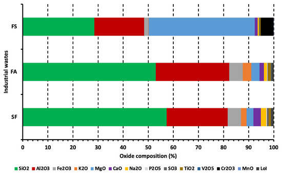 The chemical composition of industrial waste materials assessed in this work is shown in Figure 6. The chemical composition of FA and SF is approximately the same while the chemical composition of FS is different (see Figure 6). For example, SF and FA have an abundant quantity of silicon dioxide (SiO2) and aluminum oxide (Al2O3), whereas FS has a greater amount of magnesium oxide (MgO), SiO2, and Al2O3. It is important to note that the presence of calcium oxide (CaO), especially in SF, may react with Si/Al in clay in the presence of moisture to produce cementitious composites leading to the enhancement in strength properties and decrement in the swell potential of clay [56]. Similarly, the difference in oxide composition and mineral phases between clays and waste materials may cause different firing parameters, properties, and performance between waste material-clay bricks and pure clay bricks.